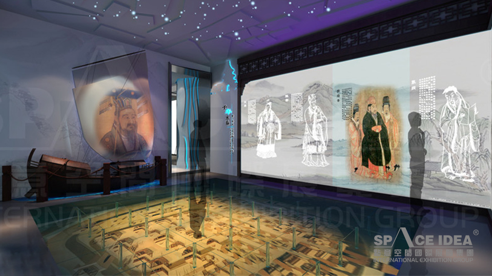 點意空間利用知識性與互動性相結合的傳達手段,打造出了一組U型屏投影裝置,在營造身臨其境的環境氛圍的同時,為參觀者的視覺與聽覺帶來雙重震撼。當人們進入空間時,仿佛置身于船頭而沉浸在揚州四季變換的山水間,實現真正意義上以“人”為核心的體驗效果。