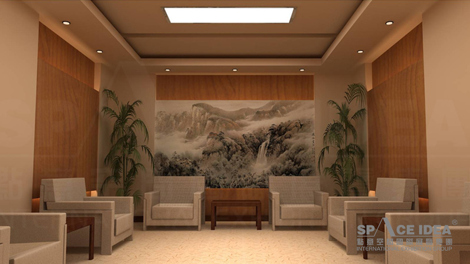 二團軍墾先輩用汗水換來的榮譽,設計時布局風格厚重、古樸,用背柜陳列的形式直觀、簡潔一目了然。臺桌上擺放了筆墨紙硯,方便領導留下墨寶。