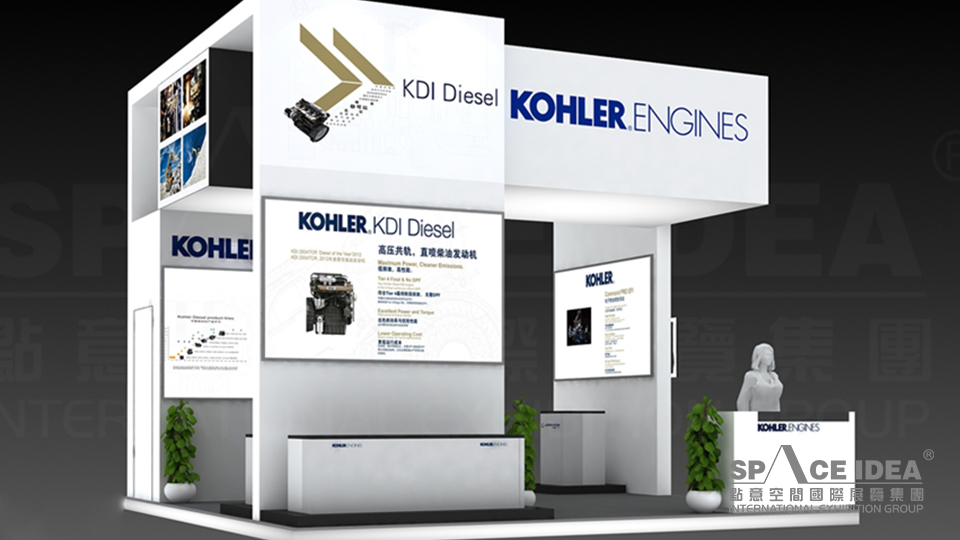本設計整體通過硬朗的塊面勾勒出了空間的簡潔、大方,突顯小空間大展臺的設計理念,展臺采用了通透式設計,人流更加通暢。在展臺中動靜畫面相結合,使得整個展臺更加靈活多變,簡潔明快的色調突顯了科勒的國際化、前衛化。畫面與產品一一對應,讓觀眾在參觀中更直接、更快的對產品了解的更多、更詳細。在展臺的頂部照明中采用了柔性天花,不僅環保而其燈光效果更佳。