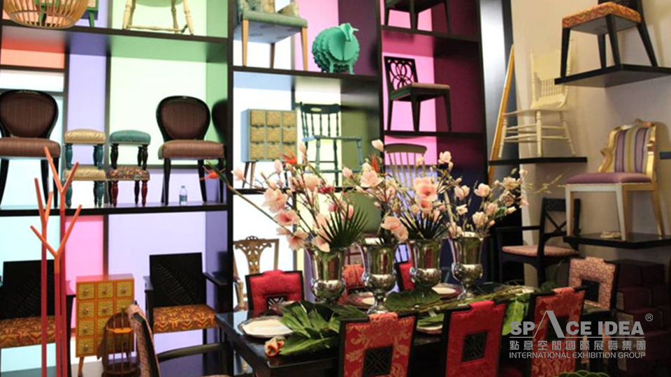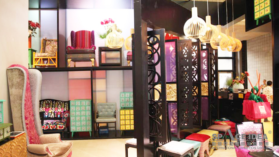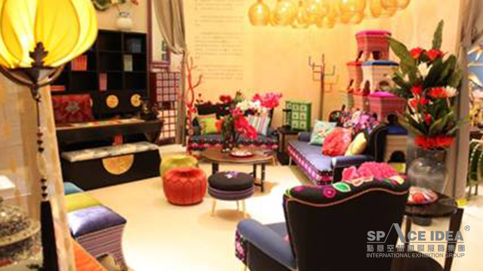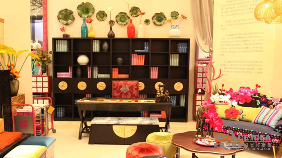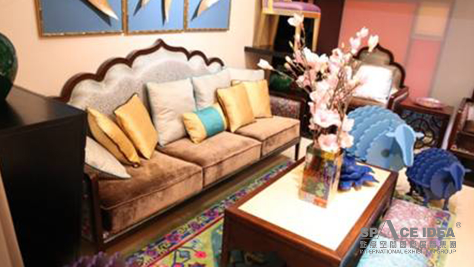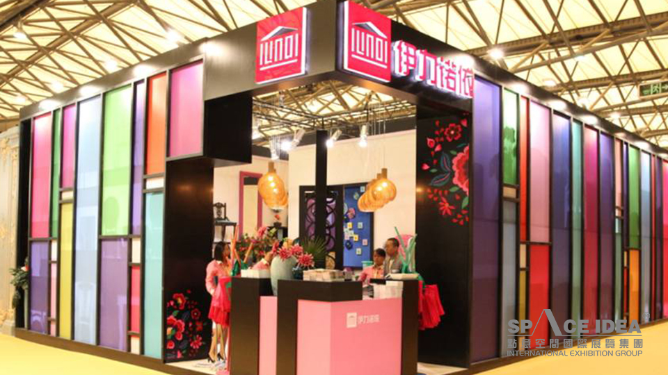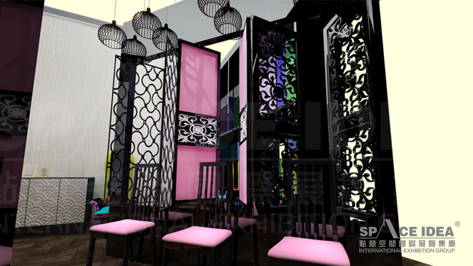 以不同色塊呈現的視覺梯度,配合黑色,體現伊力諾依對色彩的高度敏感與純熟的運用,體現了展覽主題——“羌繡”獨特的色彩搭配。在各種色塊形成的虹彩中,推出影壁式設計的接待臺,給人“曲徑通幽處”的獵奇感。
