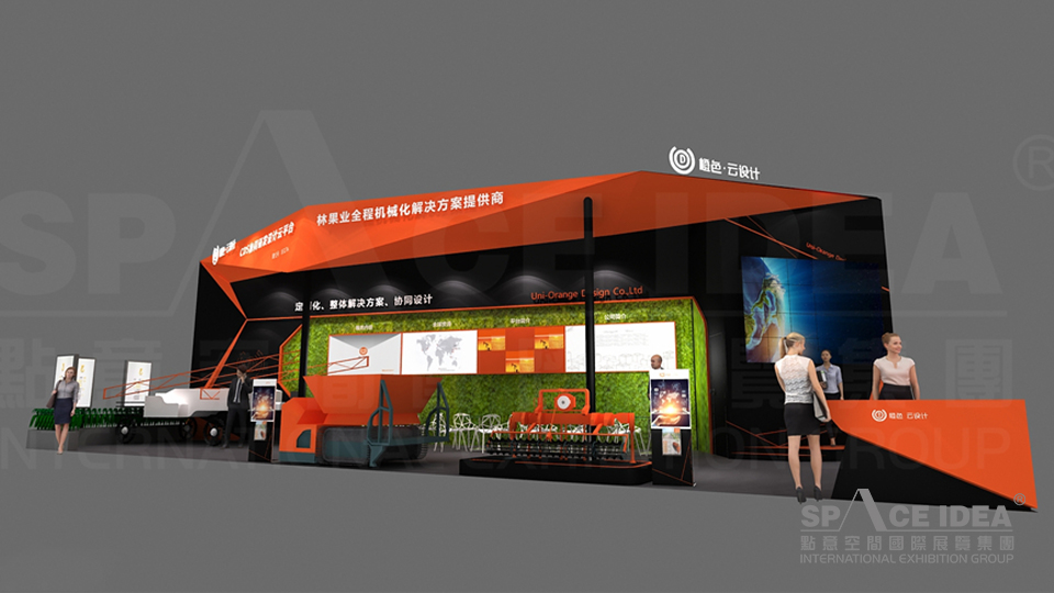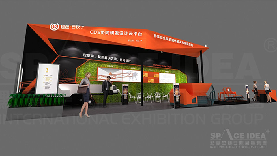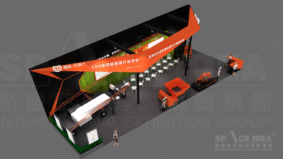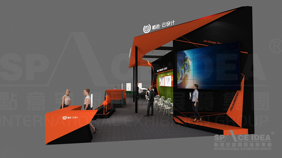 色彩上主要運用橙色和黑色為主基調,結合深灰色的地板及綠色的背景墻,通過視覺的強烈對比營造強烈的空間感,極具時代氣息,體現了橙色云歡快光輝、充滿活力的企業形象及活潑開放、不失嚴謹的創新精神。通過大型LED屏,播放橙色云自主開發的全球第一個協同設計系統OrangeCDS(即全球協同設計云)、背景墻上陳列著的橙色云企業簡介,來展示橙色云高效、快捷、優質的企業文化。
