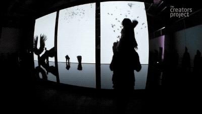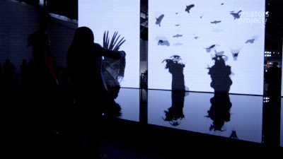 當參與者站在白色巨幕面前,做出伸展姿勢時,自己的影子就會變成巨大的翅膀展翅飛翔,如果你想去摸一下它,它又瞬間幻化成無數只的小鳥飛散而去,如同幻影一樣消失不見,是不是很有趣?